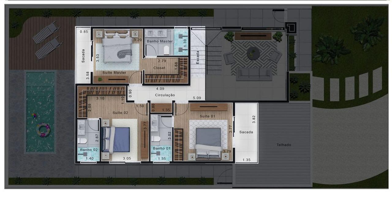 Banho Master, Sacada, Suíte 01, Banho Suíte 01, Sacada, Suite 02 e Banho Suite 02.